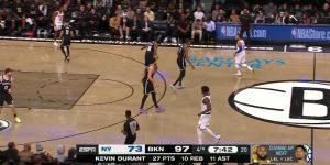 第四节,杜兰特拿到三双,球队大比分领先,他被换下之后和队友拥抱,开怀大笑。