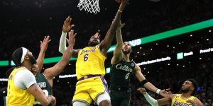 老詹持球平推硬解能力几乎无解,绿军需要在局部用人数优势阻挡老詹对篮筐的冲击。浓眉复出后在队内是个假替补,湖人内线高度和禁区攻坚能力获得了极大提升,绿军同样需要在低位对浓眉夹击——詹眉都能硬解吸引夹击,湖人获得了大量空位三分以及传切机会,这也是健康湖人的明显优势。