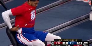 来到球馆的时候,西蒙斯穿着了一件印有艾弗森2001年MVP图案的T恤入场。
