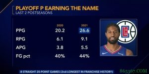 乔治出战43分钟,26投9中,其中三分球11中3,得到27分15篮板8助攻。