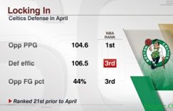 直播吧4月26日讯 今日,美媒晒出了有关凯尔特人队在四月份的防守数据。据统计,四月份至今,凯尔特人取得了9胜3负的战绩,其限制对手场均得分为104.6分,这一数据排名同期联盟第一。