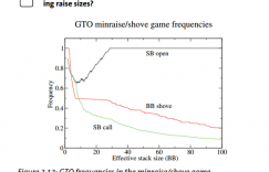 如果我们计算一下两位玩家都处在平衡状态时的各自频率,我们可以很清楚的看出它们的趋势。图3.13展示了GTO下各种筹码深度情况下小盲加注频率,大盲全压频率以及小盲跟注全压频率。(弃牌频率这些可以通过1-来得出)。从图出可以看出当大盲全压超过50%的手牌,而小盲的加注频率和跟注频率是一致的,这说明小盲加注后永远不会弃牌。而当大盲全压频率小于50%时,小盲就会加注100%的手牌。在这里还有一点需要注意,就是手牌移除效应。假设大盲的全压范围正好是50%手牌,而此时我们手持23o,我们阻隔掉了对手的一部分弃牌范围,所以当我们加注时,对手全压的频率会高于50%。而当我们手持AA时,我们阻隔掉了对手的一部分全压范围,所以当我们加注时,对手全压的频率会低于50%。所以小盲的手牌还是会影响直接弃牌和加注弃牌两者的收益——由于底牌移除效应。而这种影响会直接影响双方的GTO范围。