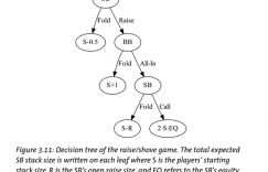 无限注单挑德州另一个简单的模型是加注/全压游戏。这个游戏的决策树如图3.11所示。小盲位先做一个非全压的加注,然后大盲可以选择全压或者弃牌,如果大盲选择全压,小盲可以选择跟注或者弃牌。在一个完整的决策树中,小盲最初的加注量通常是特定的,我们这里先放着不讨论,这个加注量的选择会很大的影响我们在这个章节中讨论的内容。