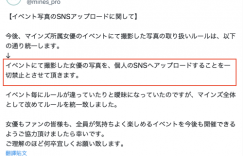 经纪公司マインズ(Mine’s)在声明中是这么说的:从现在开始,所有マインズ(Mine’s)所属的女优参加的活动一律禁止影迷将照片上传到自己的SNS(社群)上ー是,也就是说不管是参加见面会还是摄影会,你还是可以照规定拍得很开心,只是照片就只能放在自己的相机、手机或电脑上来看,想要上传到X(twitter)、IG、脸书或是其他的社群网站是不行的〜
