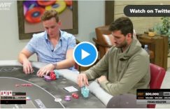 在泡沫破灭的这手牌中,Chidwick 几乎用他所有的 9BB筹码加注,后手留下了一个筹码。Punsri 跟注,他们看到了翻牌2♥8♣7♣,然后二人全下了。
