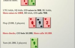 他的随后check范围通常混合了决定不继续进攻的空气牌和做底池控制的Qx牌。后者价值太薄无法为了价值下注三次,最适合在转牌圈check,因为以这种方式游戏永远不会被加注,也给那些他将对河牌圈领先下注弃牌的牌一些保护。TT并非我们在非T河牌面想要领先下注范围的一部分,而在这个特定河牌面,我们不应该有一个任何类型的领先下注范围。为什么这样?