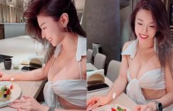 這樣的壽星真是太有心了,不只自己生日快樂也讓大家快樂起來!眼前坐在餐桌邊的長髮正妹就是「趙倍兒」,大旁分可見那張精美迷人的笑顏,桌上小巧精緻的小蛋糕正是為她準備的生日小禮,但最不容忽視的,還是那兇猛的上半身,白衣領搭上交叉的綁帶,根本就快撐不住那呼之欲出的巨乳! (
