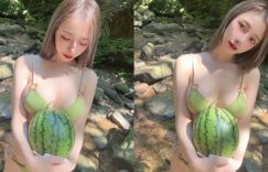 請問畫面中有幾顆西瓜?JKF女郎丁丁dingding最近到溪邊戲水,想用冰涼的河水泡西瓜,但一把西瓜抱起來,兇猛畫面就引起網友熱議,本來就穿著綠色比基尼的丁丁dingding,兩顆豐滿的美乳加上抱著的那一顆,乍看之下有三顆西瓜,別的西瓜都解渴又消暑,但丁丁dingding的西瓜讓人越看越上火啊!