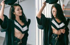 求學路佔據了人生一大部分,如今畢業當然要用最美嫩的肉體致一下青春,這位火辣美女【Effi】,一身黑色學士服大開衣襟,白色大V領巾下居然什麼都沒穿,露著鮮嫩欲垂的白皙南半球,短褲上還有著性感腰線,不只是男同學,連教授、教官還是校長都看了下巴落下、口水狂流!
