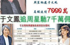 周星驰被前女友于文凤追讨7000万周星驰的前女友是于文凤,2012年这位前女友亲自把周星驰告上法庭,据悉,其中的原因是周星驰拖欠了公司佣金7000万元。周星驰身边的朋友也曾经透露过,星爷是一个比较“抠”的人,把钱看得很重。