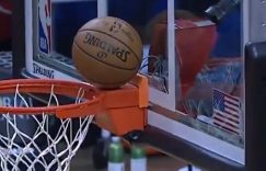 直播吧4月24日讯 快船VS火箭的比赛正在进行中。比赛第一节刚开始时,乔治突破造成奥利尼克阻挡犯规,在把球随手一扔到篮筐上时,球竟然奇迹般停在了后筐。