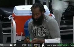 直播吧3月25日讯 篮网客场挑战爵士,首节17-38落后21分。这场比赛组织核心哈登缺阵,篮网全队首节仅1次助攻,3次失误,投篮命中率28中7,三分11中2。