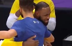 直播吧3月1日讯 刚刚结束的一场NBA常规赛,湖人主场击败勇士。赛后,湖人球星詹姆斯正在场边接受媒体的采访,当看到库里从眼前走过时,詹姆斯立马摘下耳机中断了赛后采访和库里进行拥抱寒暄示意。