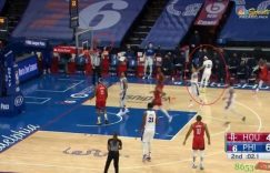 直播吧2月18日讯 76人队今日主场迎战火箭,半场比赛76人69-43领先火箭26分。半场比赛76人最后一攻快速反击,小库里接到哈里斯的传球,右侧45度自信三分射出,并且提前转身,三分划过美妙弧线进入篮筐。