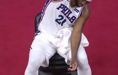 【大发扑克】略有不适?恩比德被替换下场在替补席做背部伸展运动
